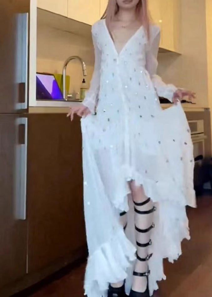Fashion White V Neck Asymmetrical Design Sequins Dresses Long Sleeve
