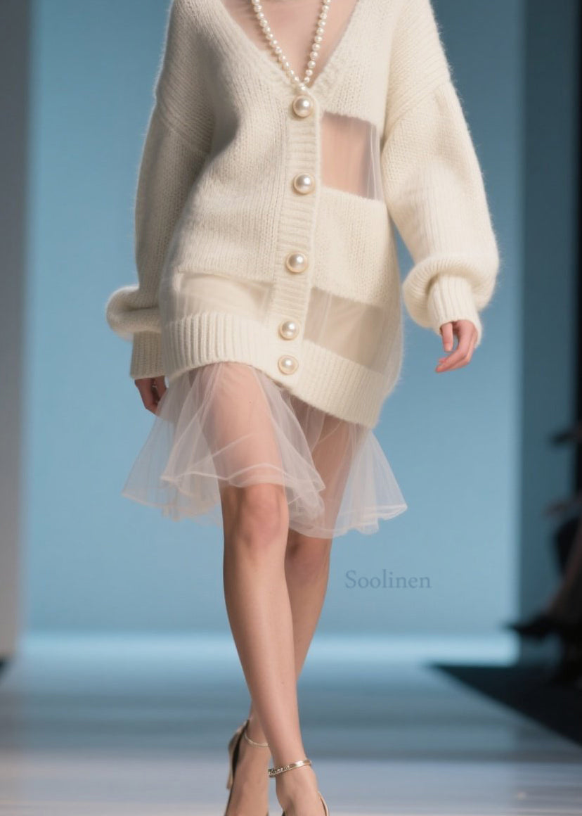 Fitted Beige O Neck Tulle Patchwork Knit Sweater Dress Fall