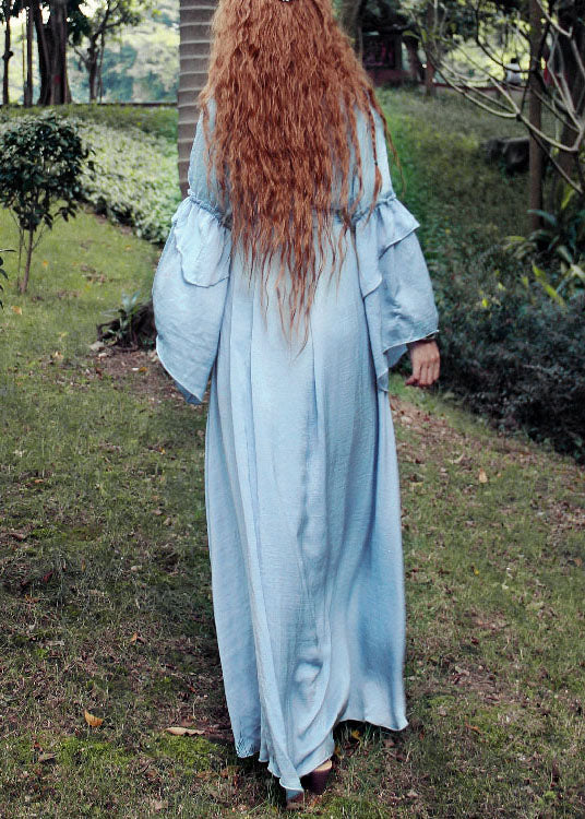 Fitted Blue O-Neck Tie Waist Exra Large Hem Silk Long Dresses Petal Sleeve