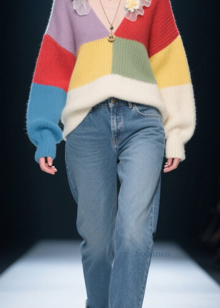 Fitted Colorblock V Neck Ruffled Floral Knit Pullover Fall