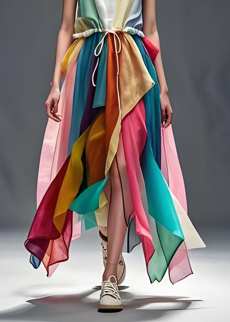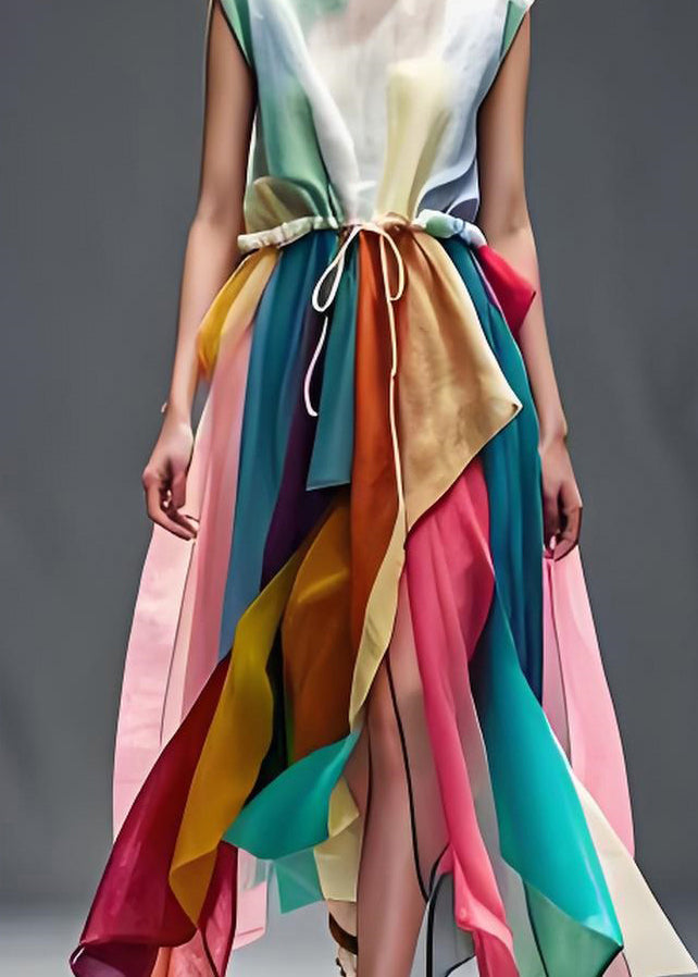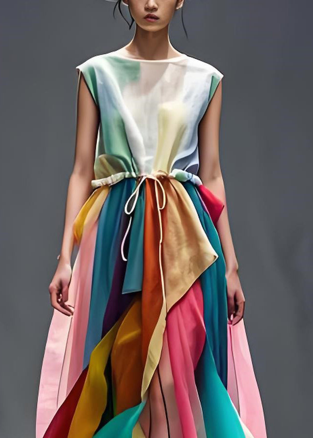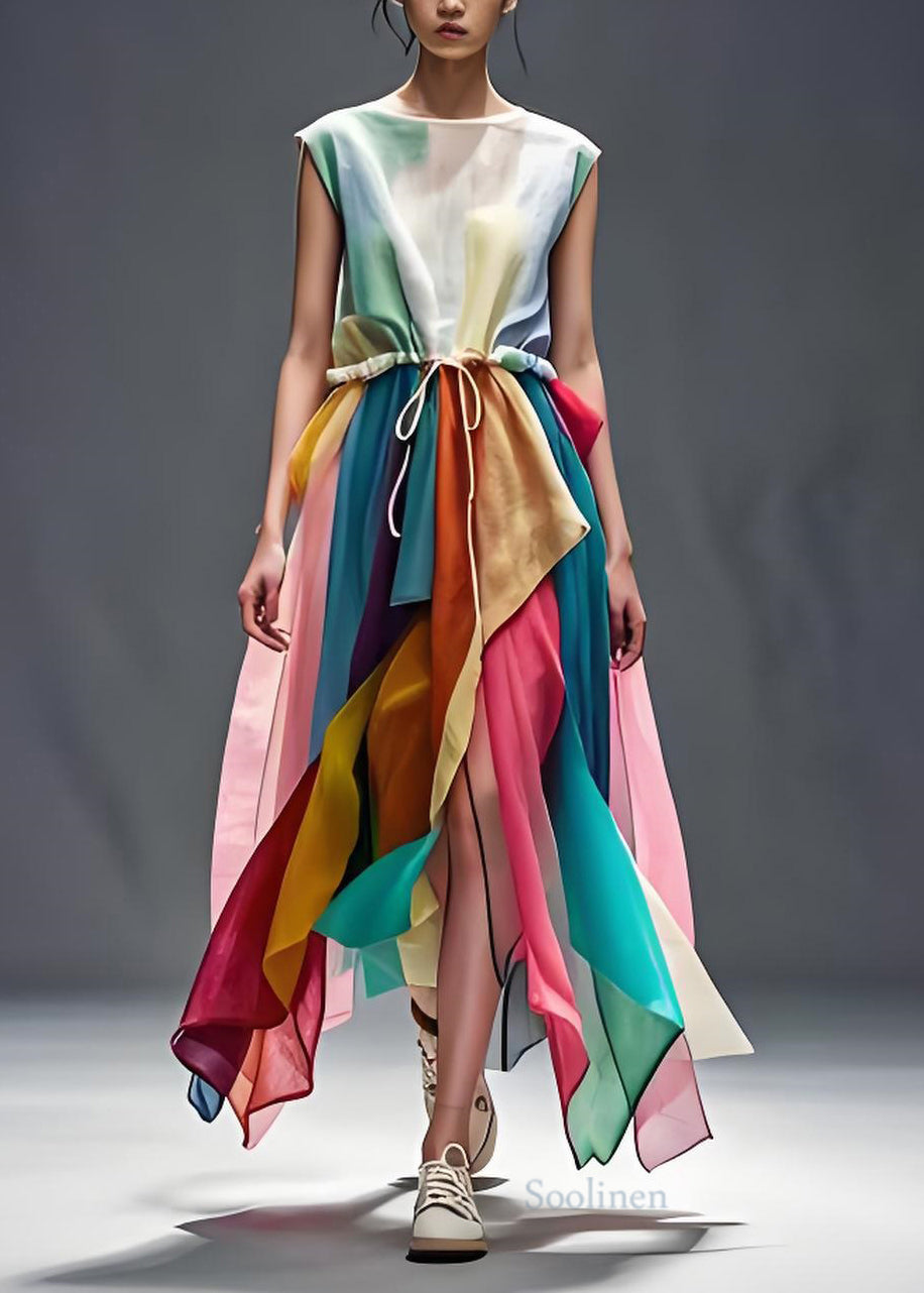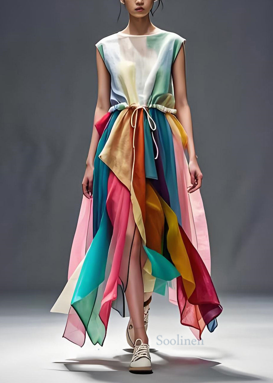 French Asymmetrical Lace Up Patchwork Cotton Dress Sleeveless