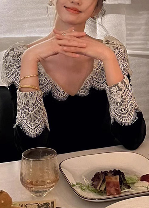 French Black V Neck Lace Patchwork Silk Velvet Dresses Spring