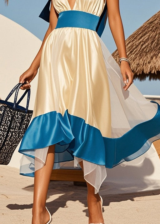 French Champagne Patchwork Exra Large Hem Silk Party Dresses Summer