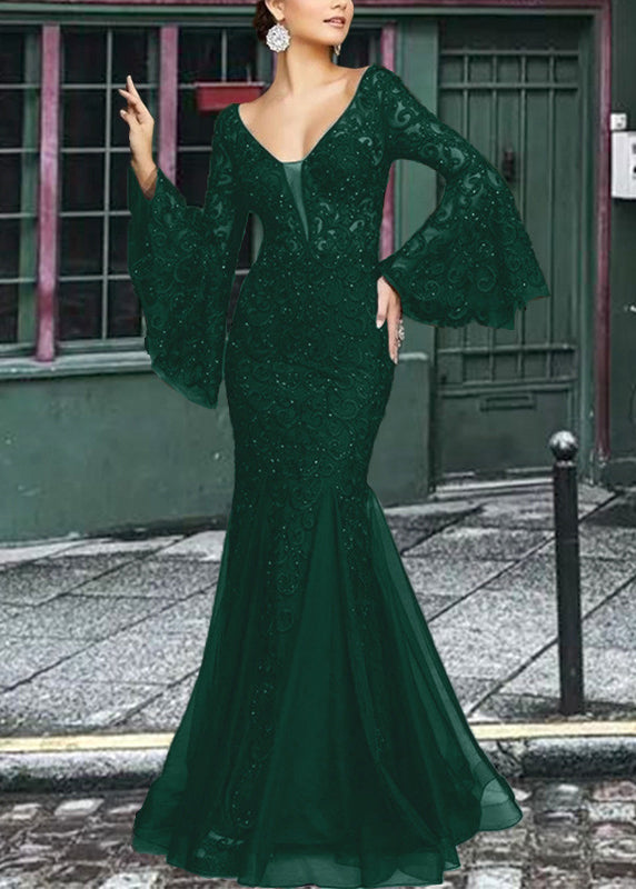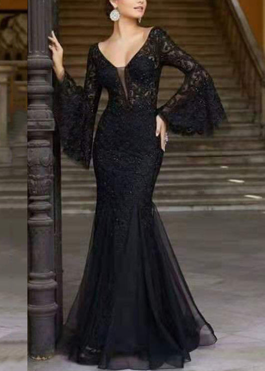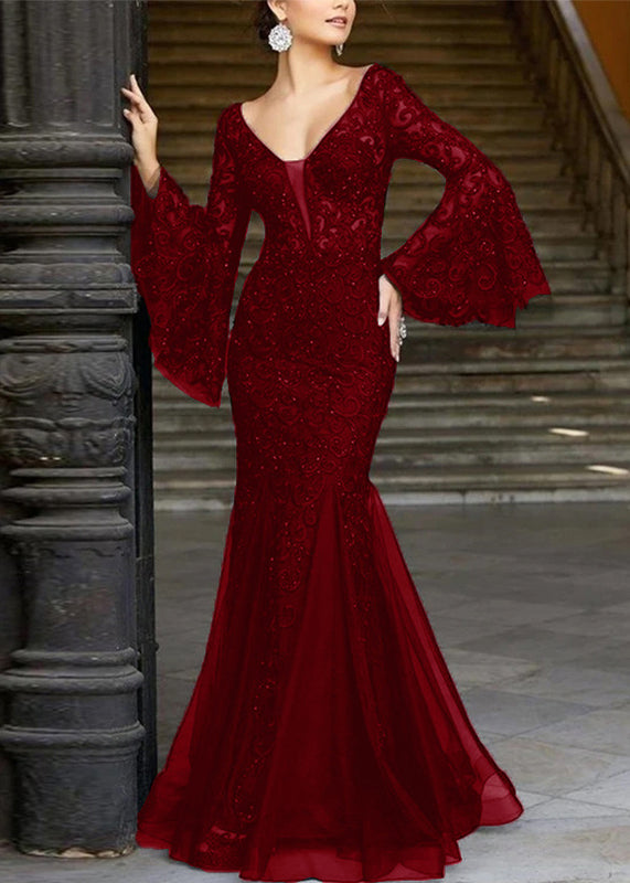 French White Embroidered Solid Lace Fishtail Dresses Flare Sleeve