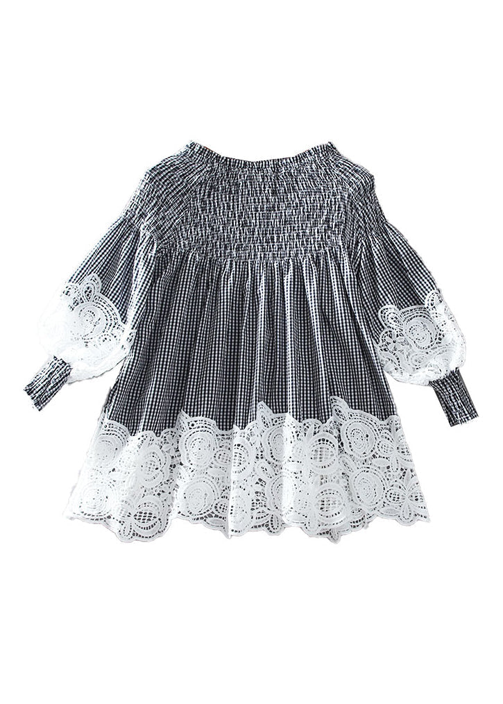 French White O-Neck Wrinkled Patchwork Hollow Out Shirt Long Sleeve