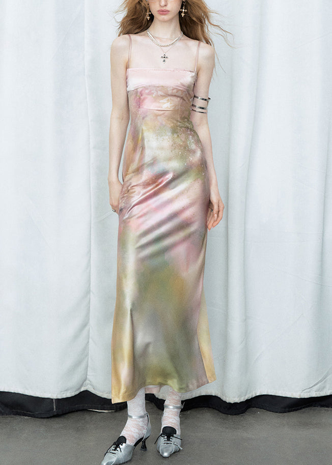 Gradient Color Side Open Silk Spaghetti Strap Dress Cold Shoulder Summer