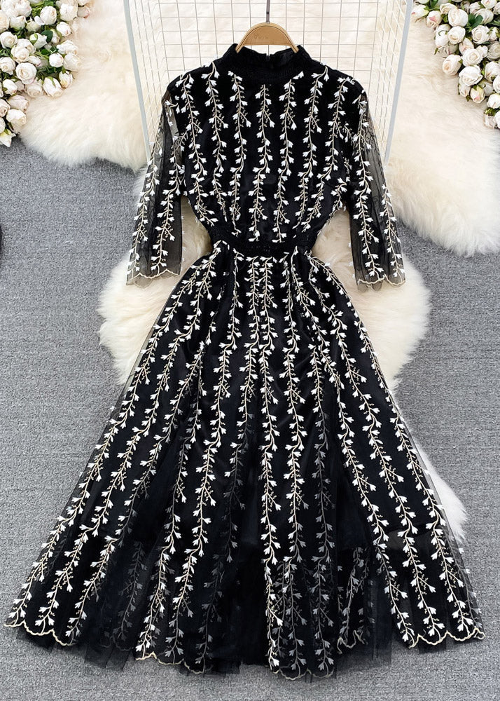 Handmade Black O-Neck Embroideried Tulle Patchwork Tunic Long Dress Half Sleeve