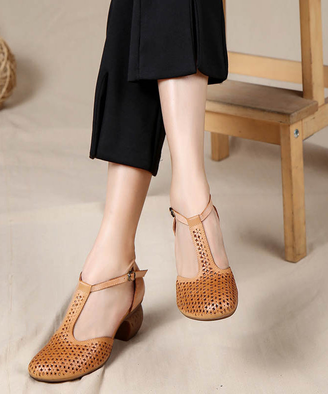 Handmade Grey Cowhide Hollow Out Leather Buckle Strap Chunky Sandals