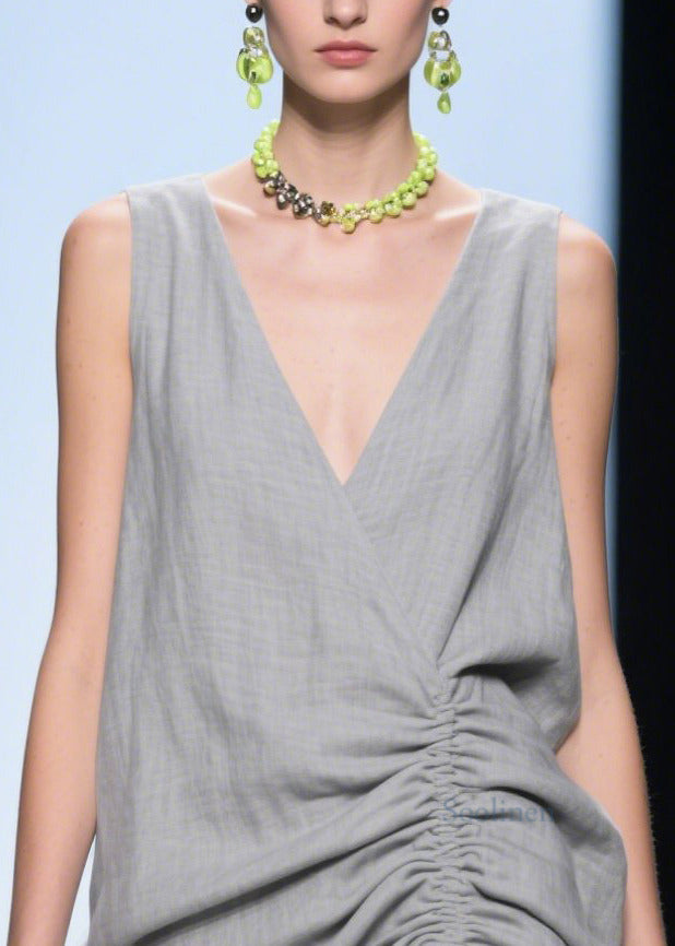 Handmade Grey Wrinkled Side Open Linen Mid Dress Summer