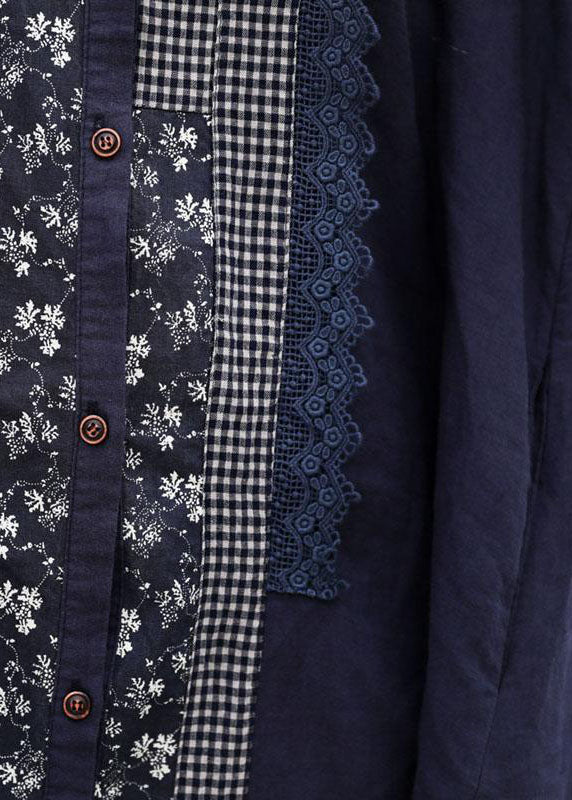Handmade linen Robes Fashion Retro Blue Splice Turn-down Collar Linen Dress