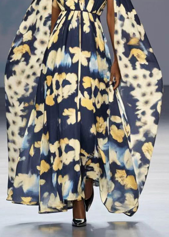 Italian Black Cinched Print Chiffon Party Dresses Cloak Sleeves