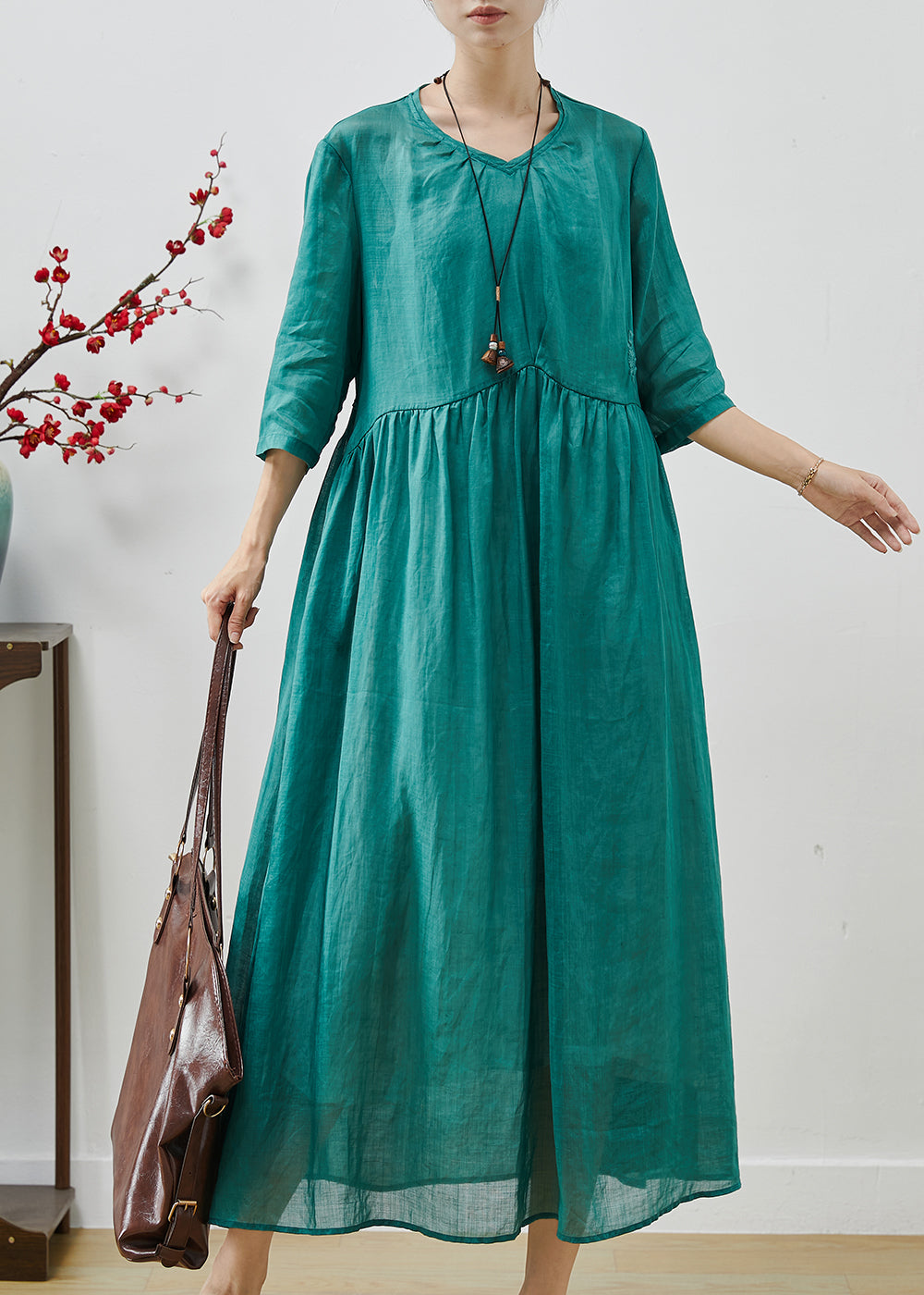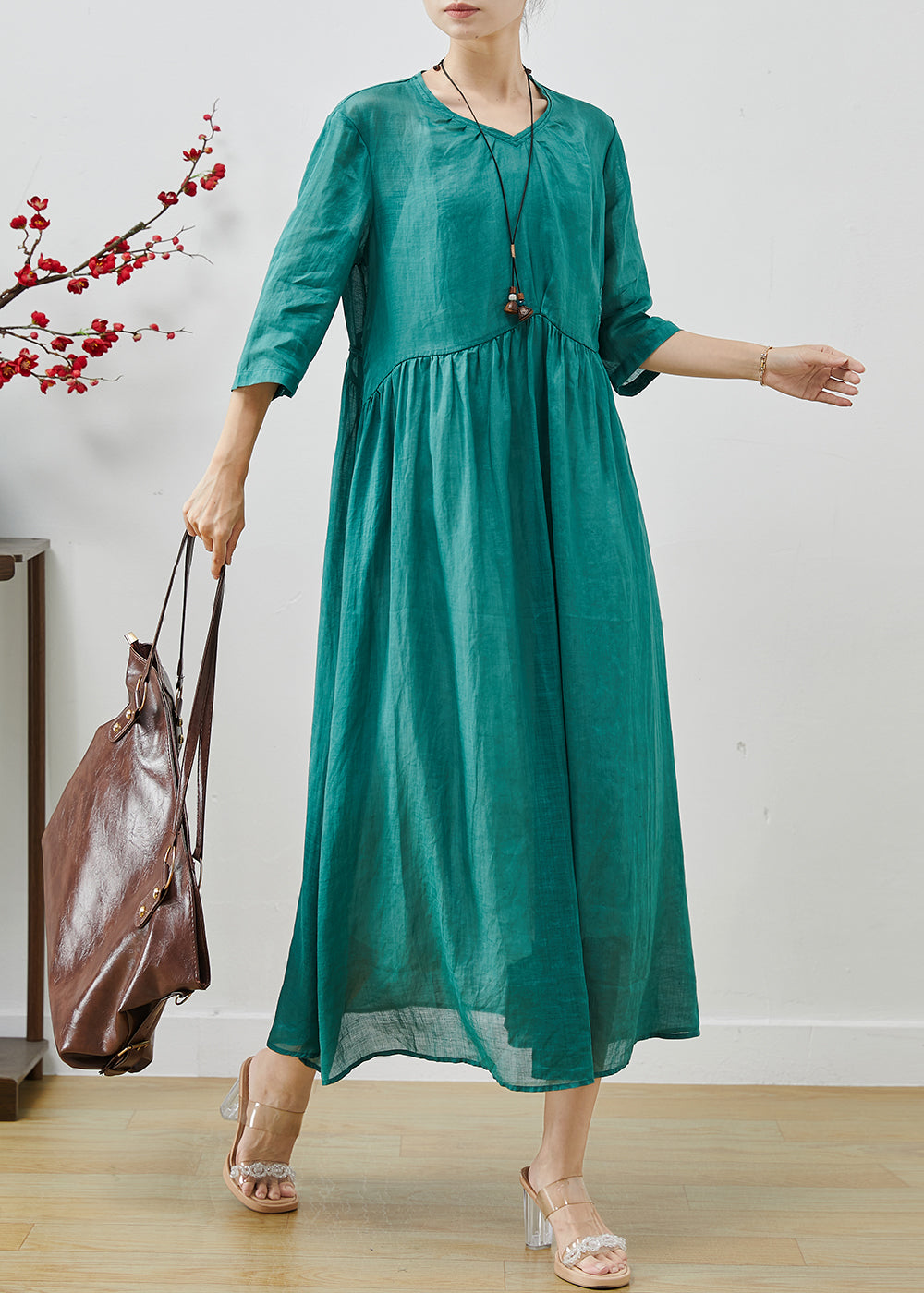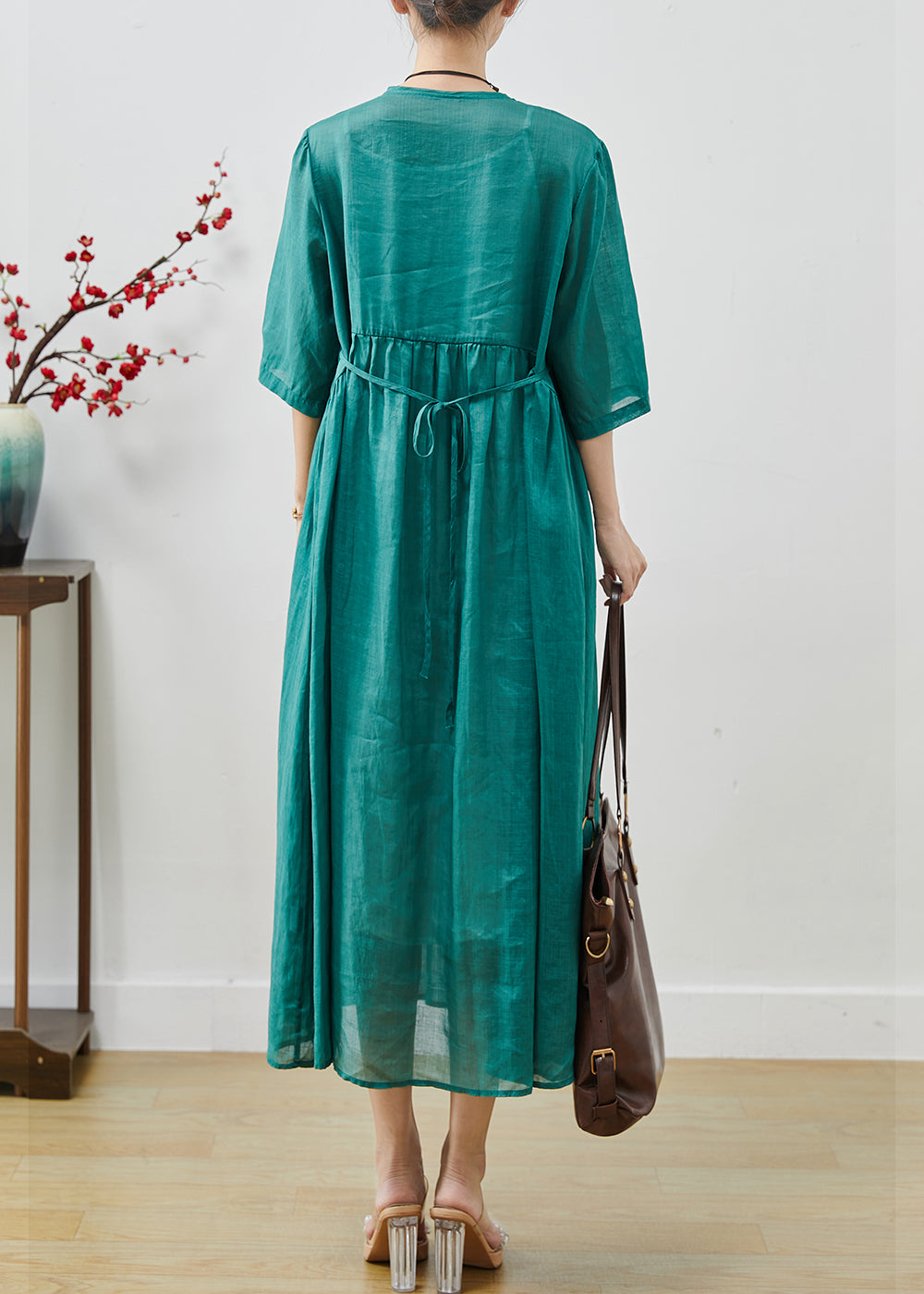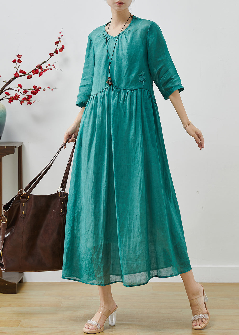 Italian Green Embroidered Floral Linen Holiday Dress Bracelet Sleeve