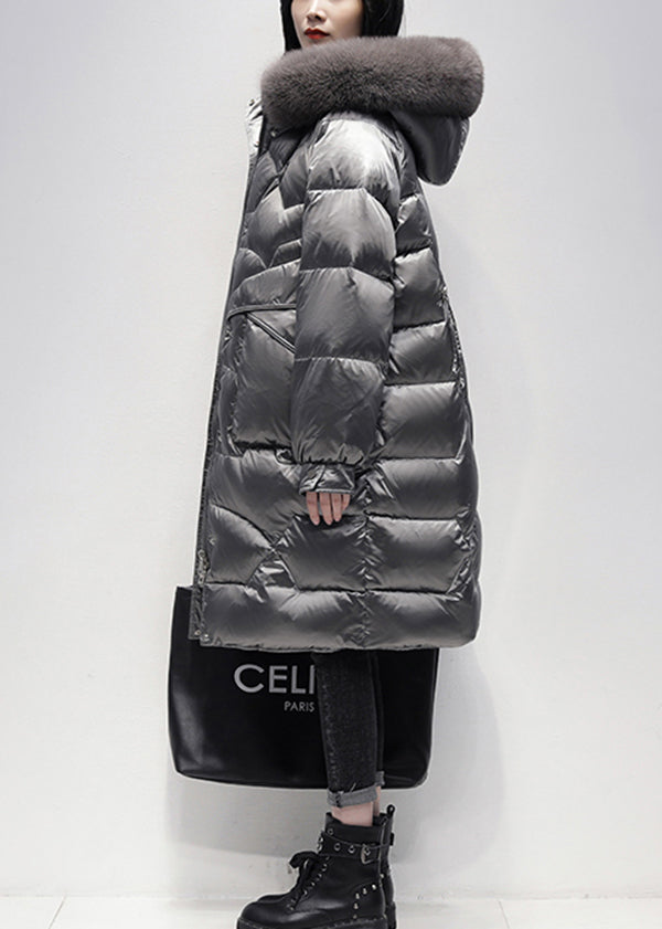 Italian Grey Zip Up Fur Collar cotton blend Hooded Coat Winter