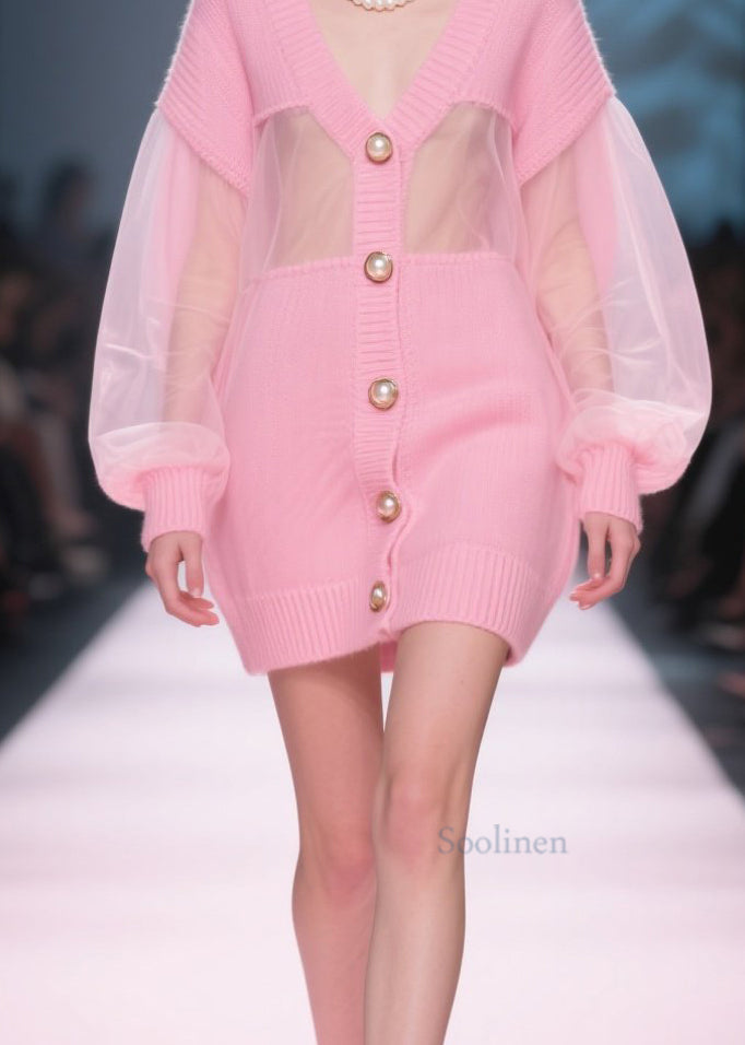 Italian Pink V Neck Tulle Button Patchwork Knit Cardigan Fall