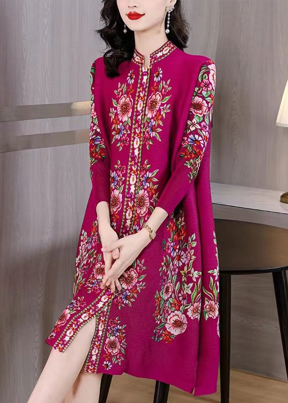 Italian Purple Stand Collar Print Wrinkled Cotton Mid Dress Spring