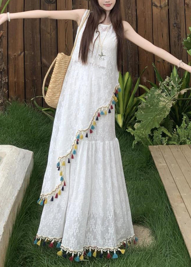 Italian White Asymmetrical Tasseled Tops And Skirts Two Pieces Set Sleeveless