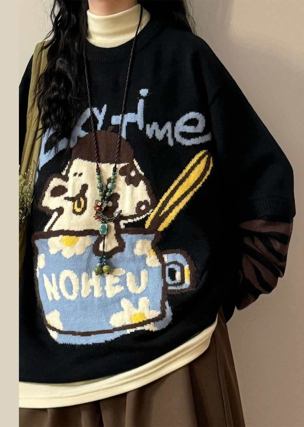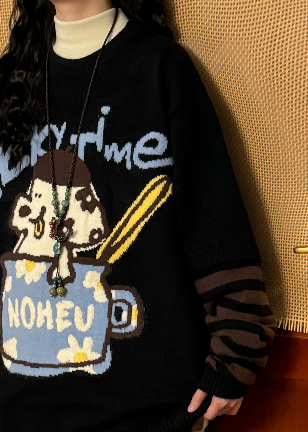 Jacquard Black Asymmetrical Striped Patchwork False Two Pieces Knit Sweaters Spring