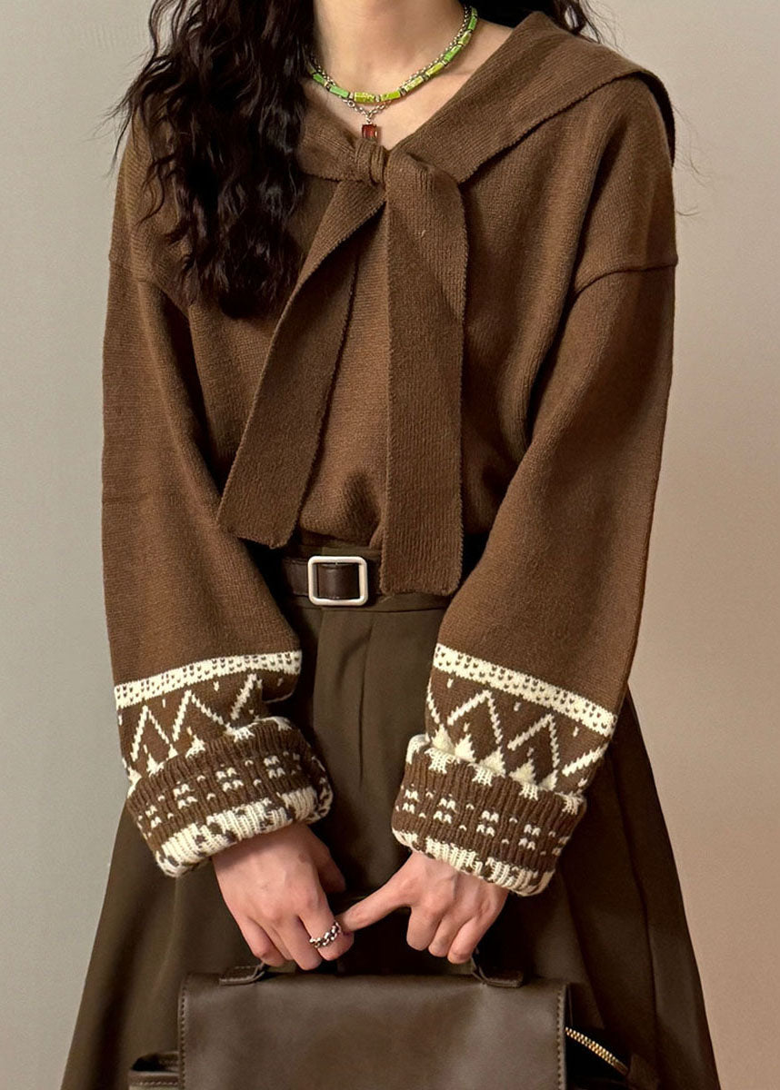 Jacquard Coffee Sailor Collar Lace Up Knit Sweater Spring