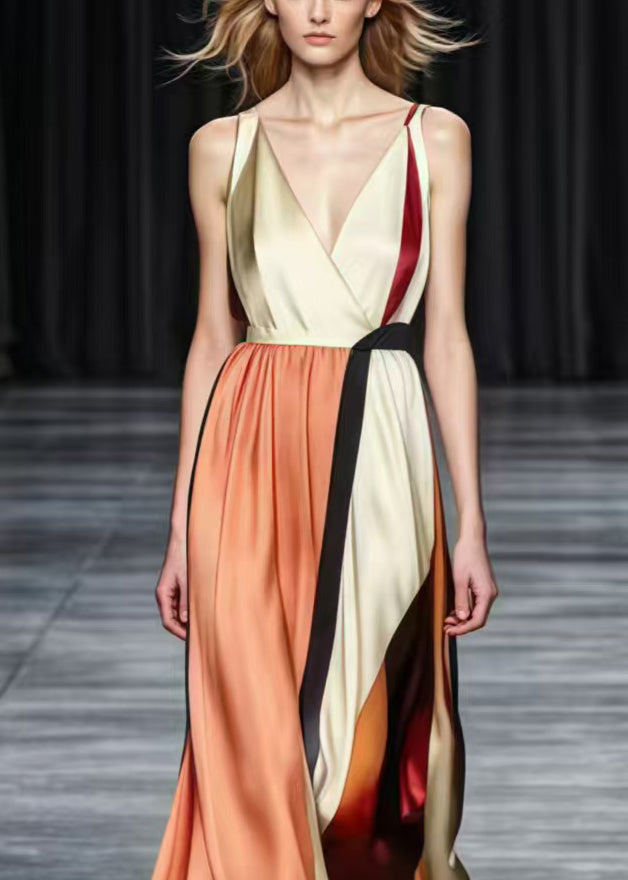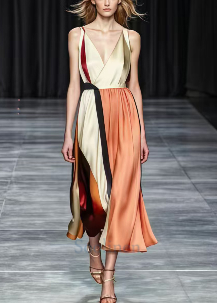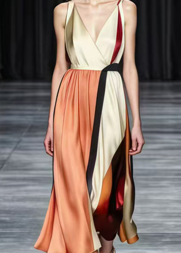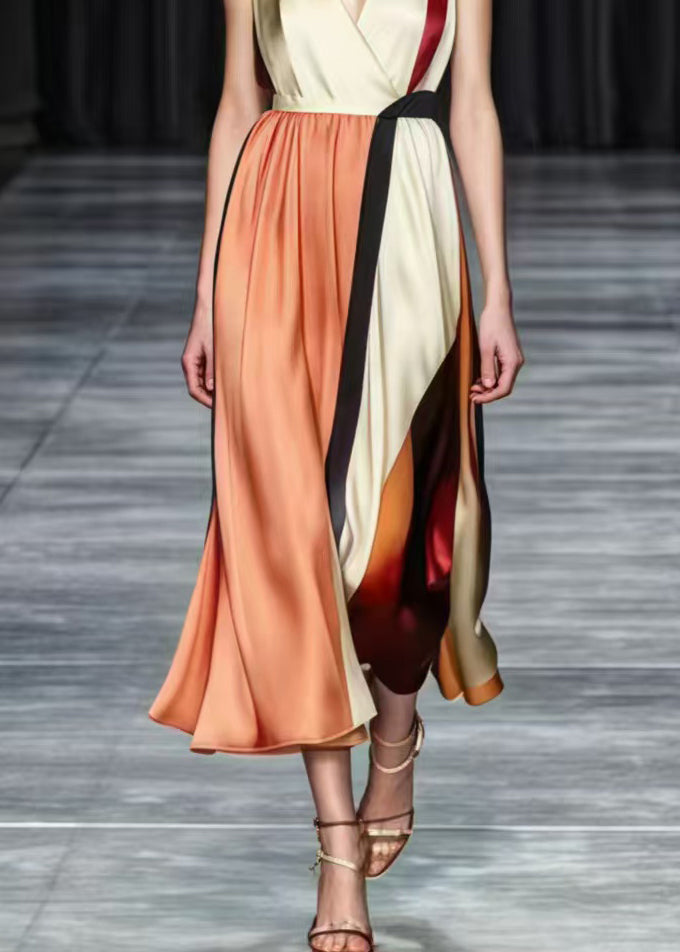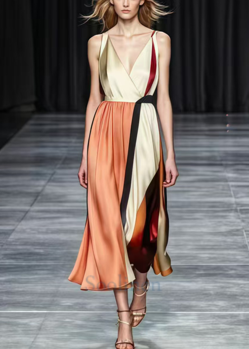Khaki Patchwork Silk Cinched Dress V Neck Exra Large Hem Summer