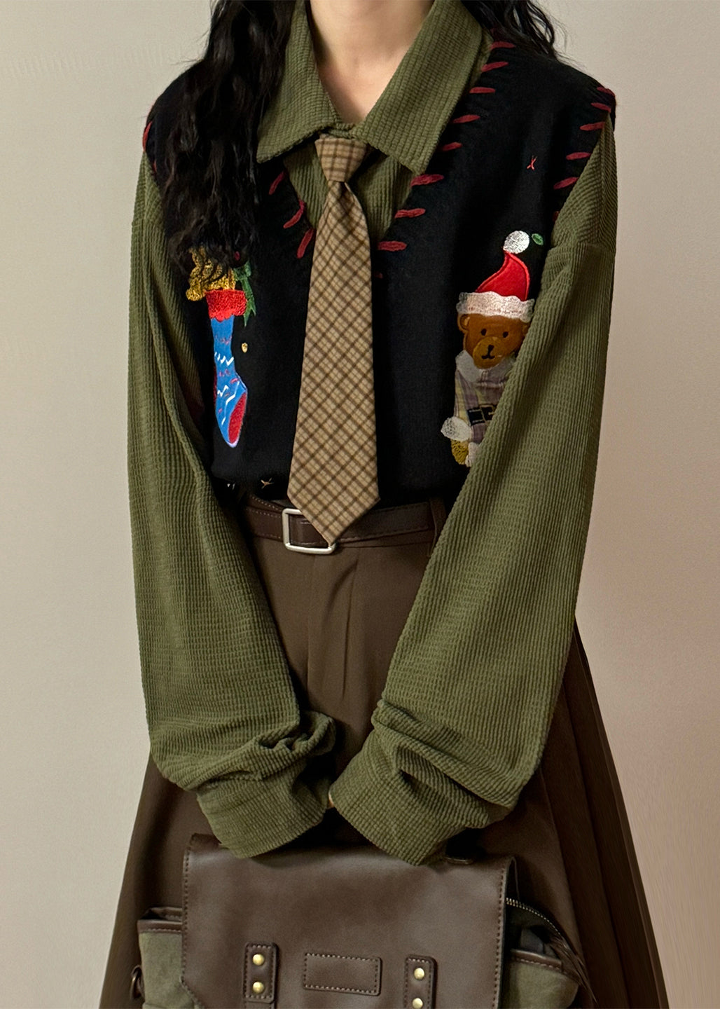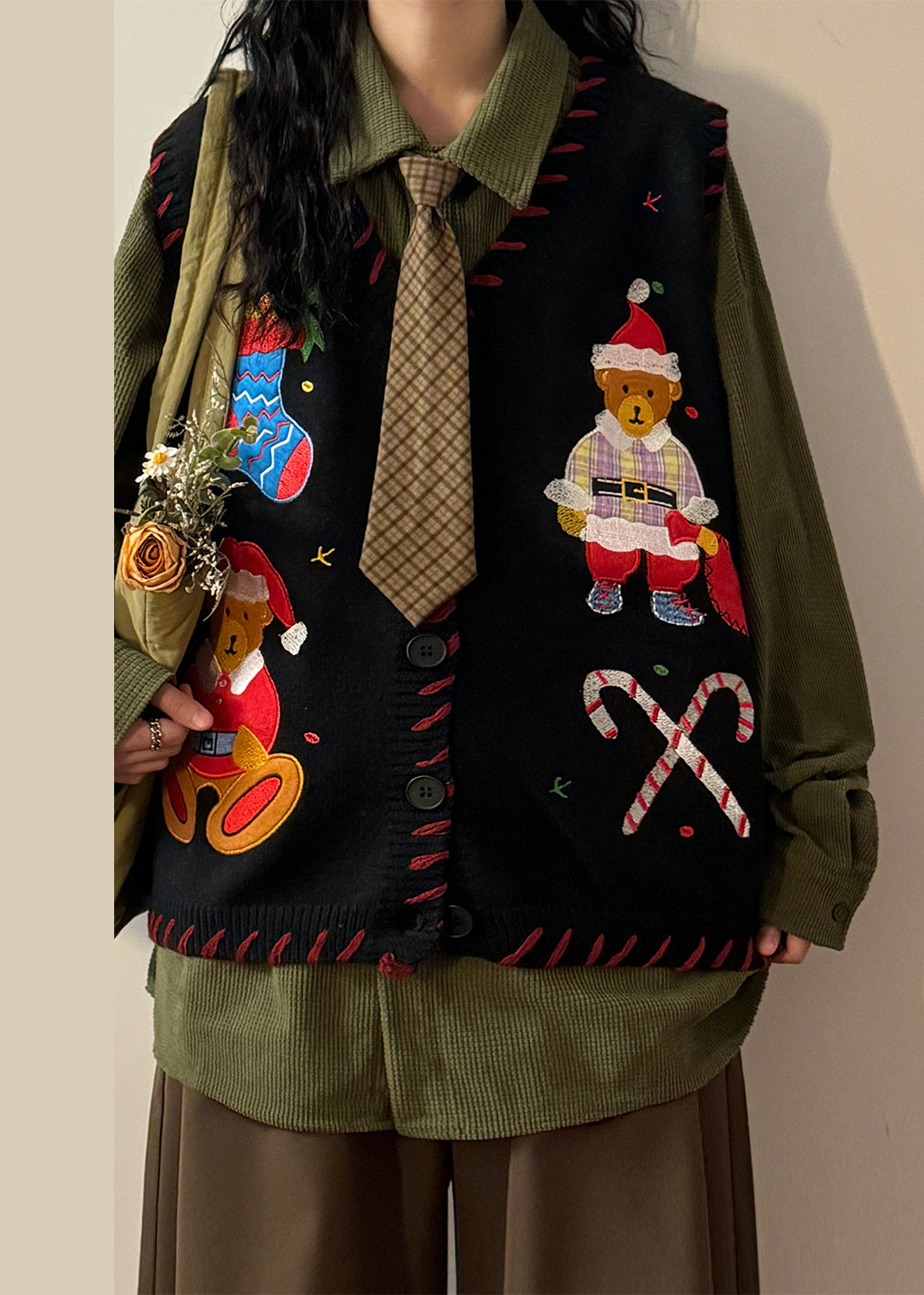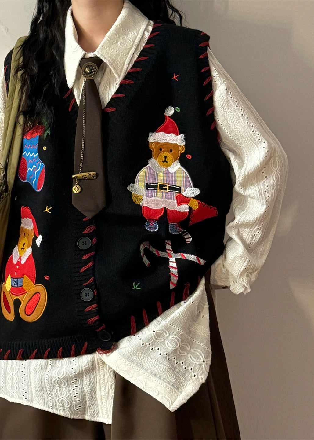 Loose Black V Neck Character Button Knit Waistcoat Sleeveless