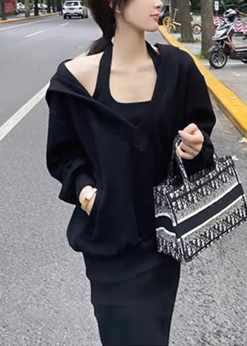 Loose Pink Hooded Pockets Tops And Dress Cotton Two Pieces Set Spring