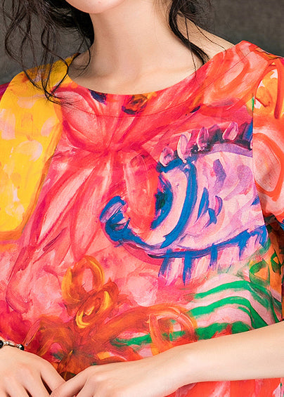 Loose red print linen dresses Fitted design o neck Half sleeve Plus Size Summer Dress