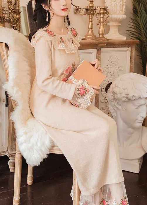 Modern Apricot Embroidered Floral Patchwork Tulle Knit Long Sweater Spring