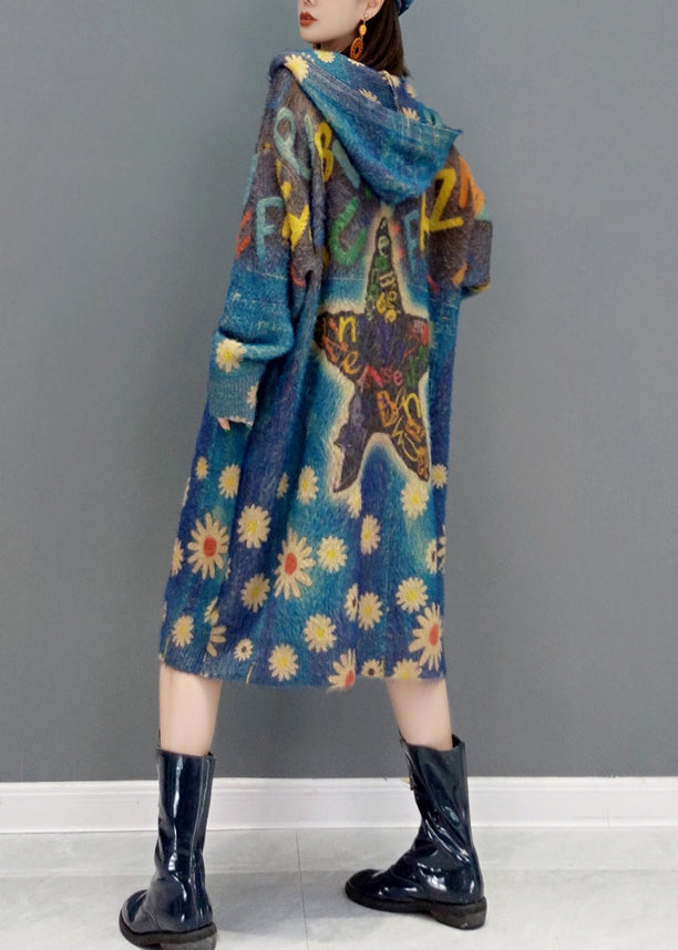 New Blue Hooded Pockets Print Knit Sweater Coat Winter