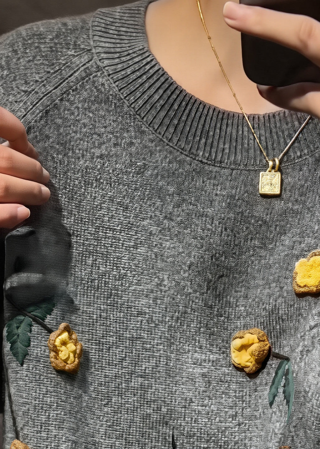 Novelty Grey O-Neck FloralCozy Cotton Knit Sweaters Fall