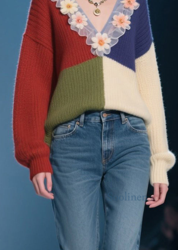 Organic Colorblock V Neck Ruffled Floral Knit Top Fall
