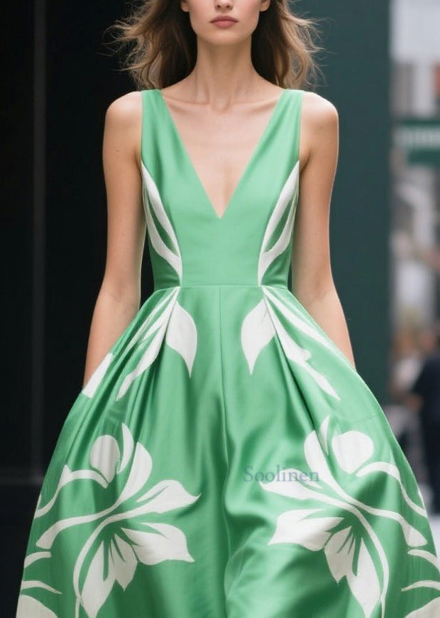 Organic Fruit Green Print Silk Cotton Vacation Dress Summer