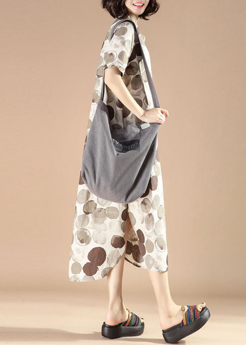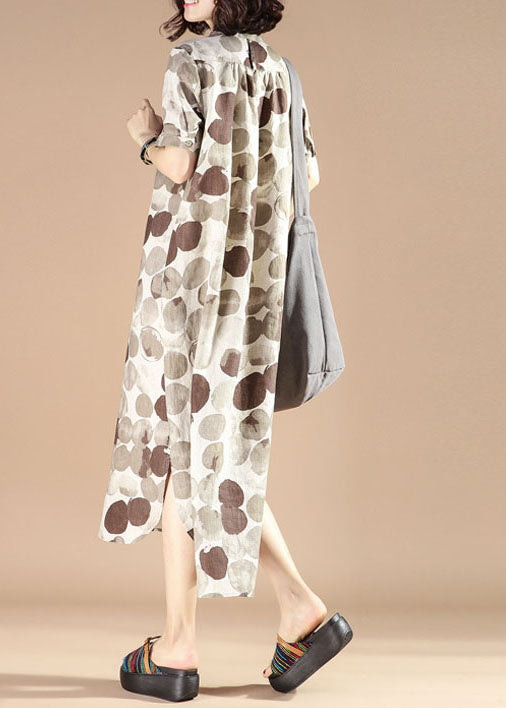 Organic Grey Stand Collar Print Patchwork Linen Dresses Summer