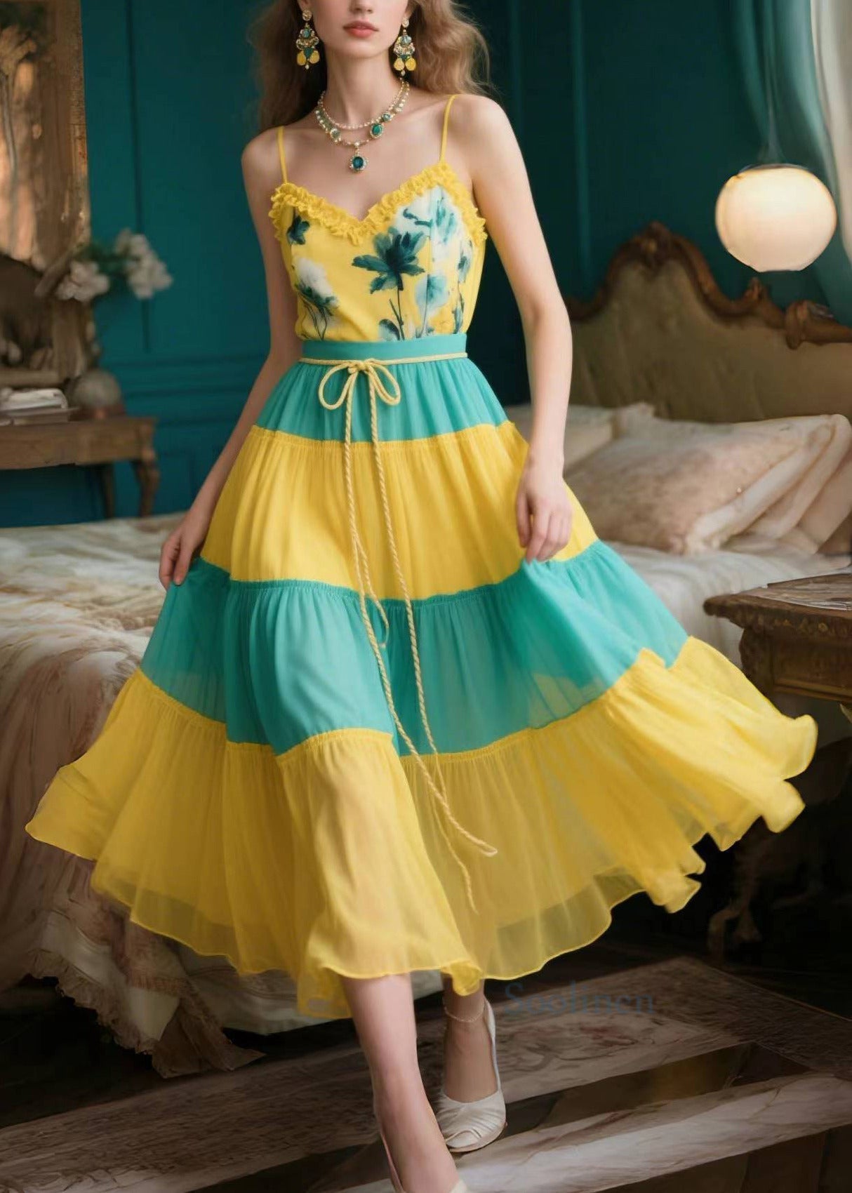 Organic Yellow Ruffled Patchwork Chiffon Spaghetti Strap Dress Summer
