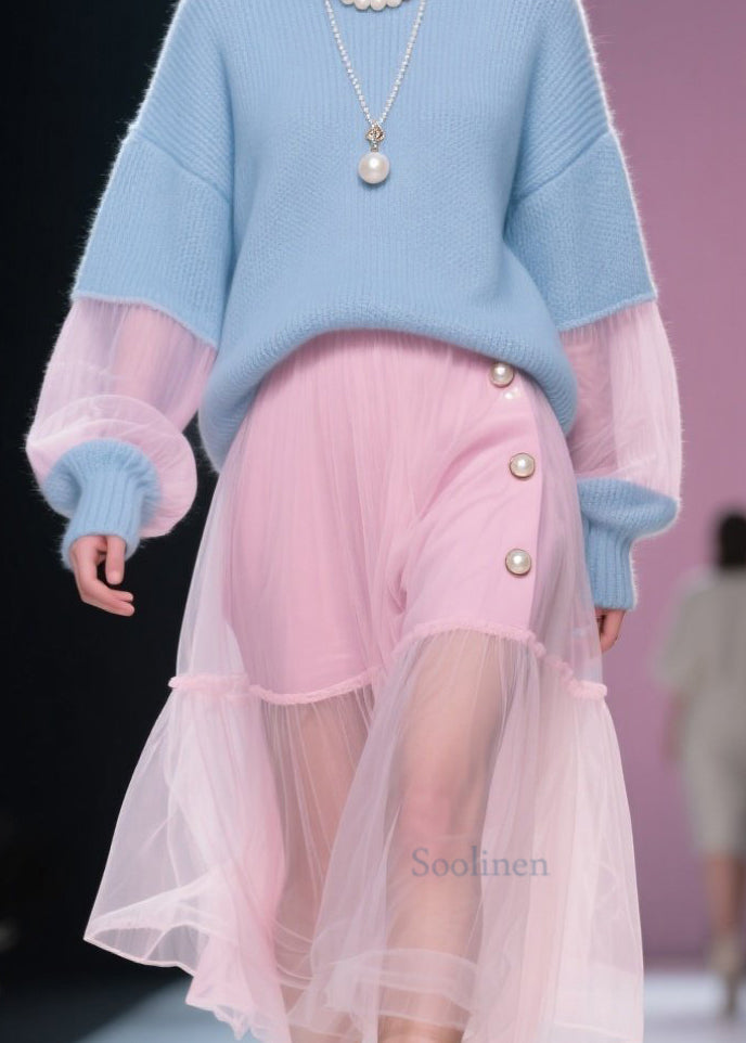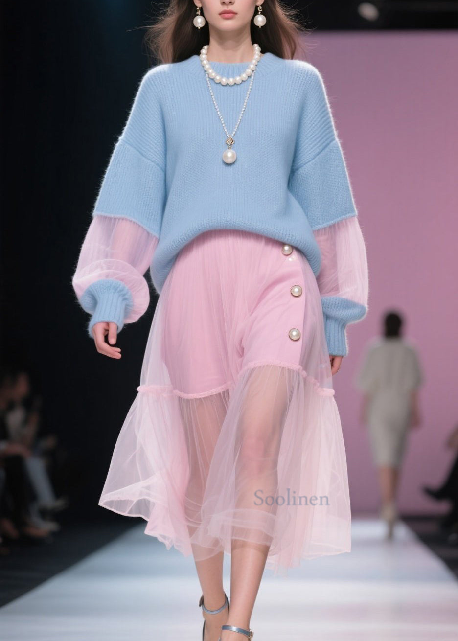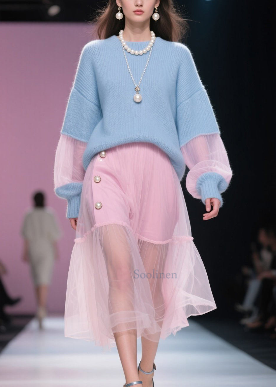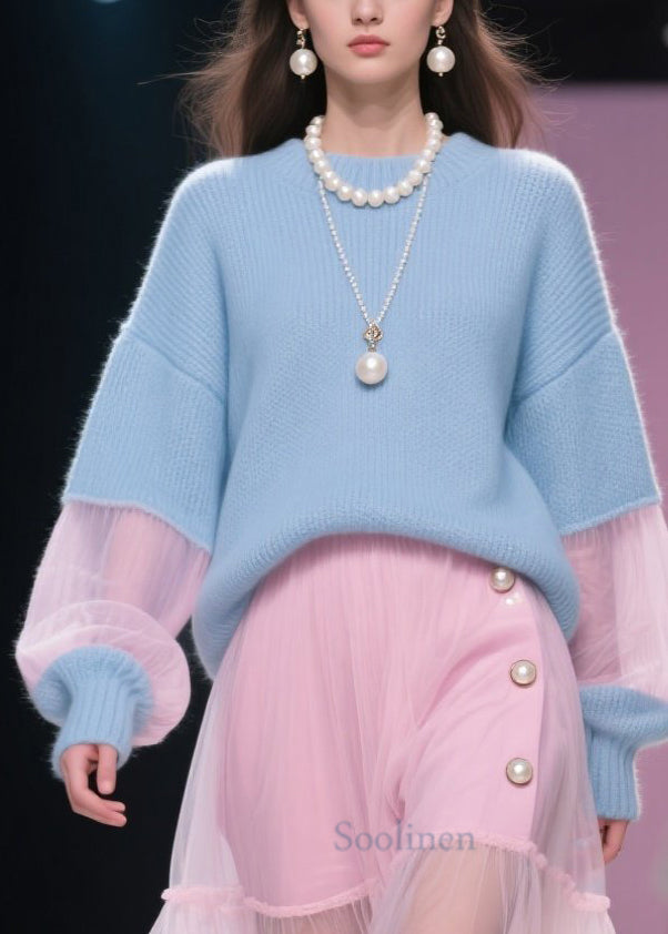 Plus Size Blue O Neck Patchwork Knit Short Sweater Winter