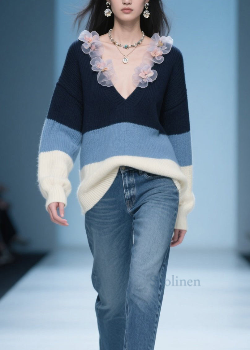 Plus Size Colorblock V Neck Floral Knit Sweater Fall