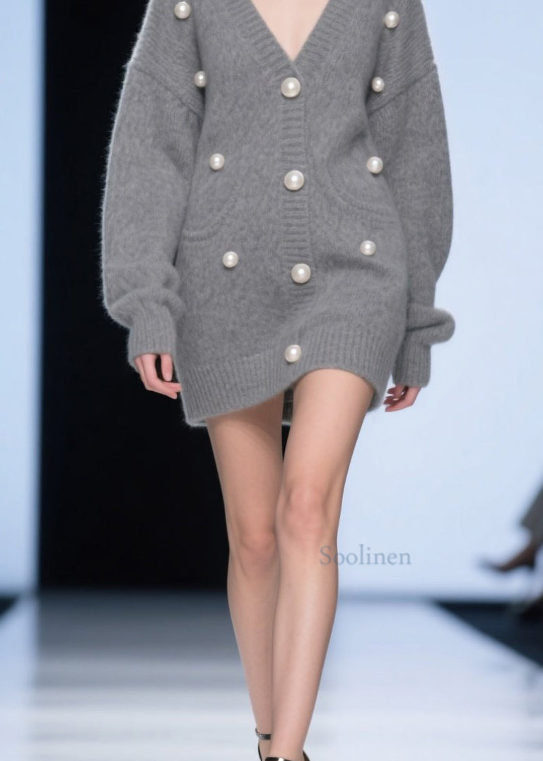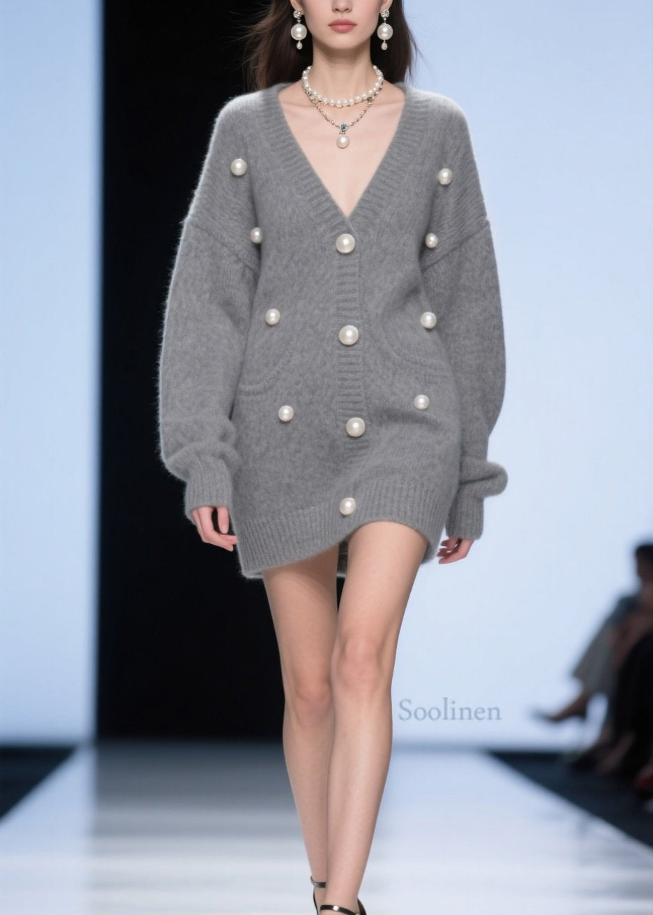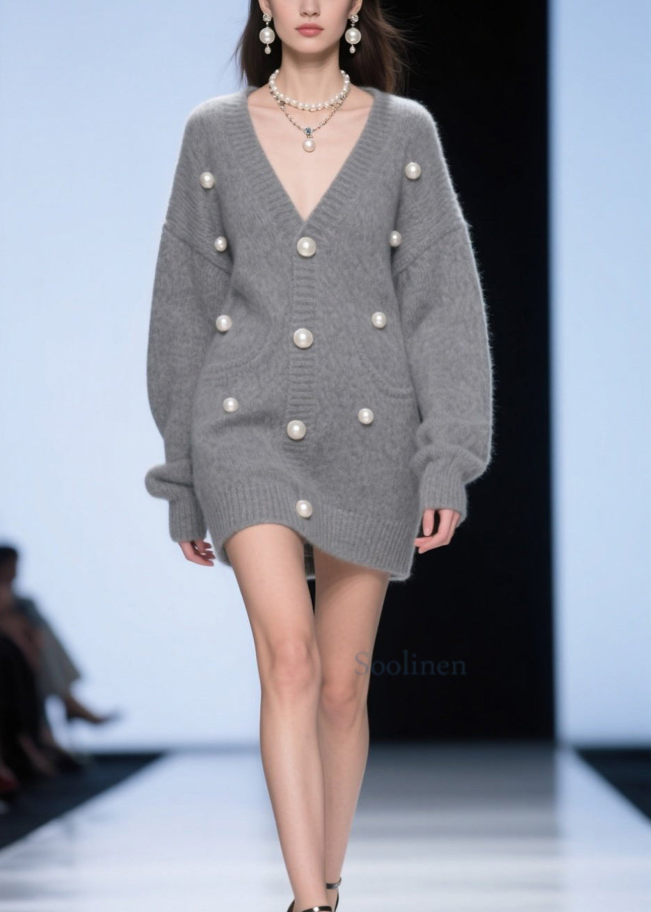 Plus Size Grey V Neck Nail Bead Patchwork Knit Cardigans Fall