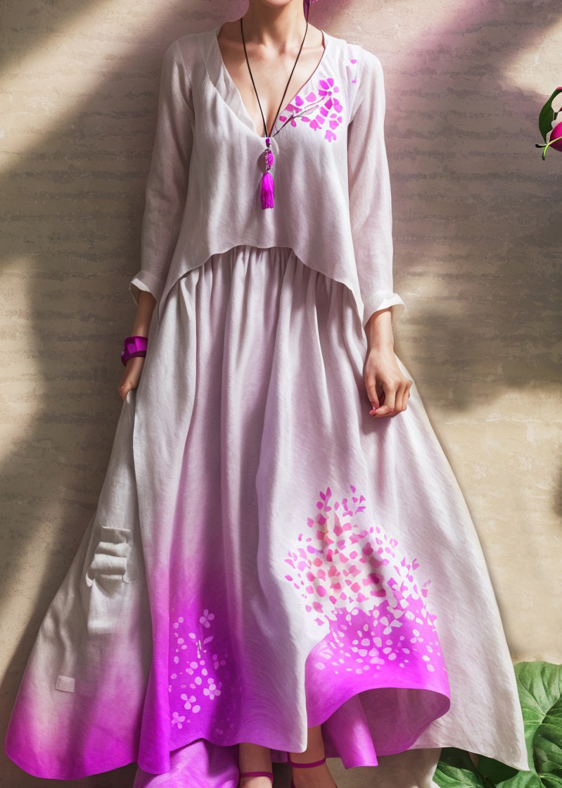 Plus Size Purple Gradient V Neck Print Wrinkled Patchwork Silk Dress Summer
