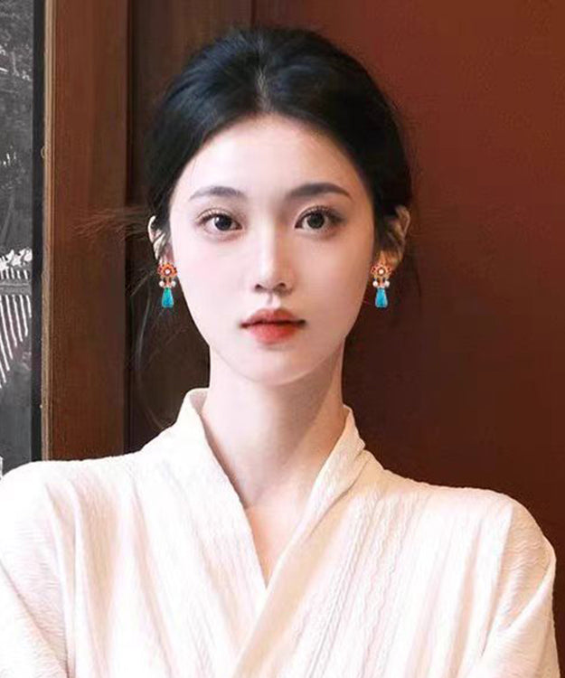 Retro Colorblock Ancient Gold Overgild Inlaid Pearl Enamel Floral Drop Earrings