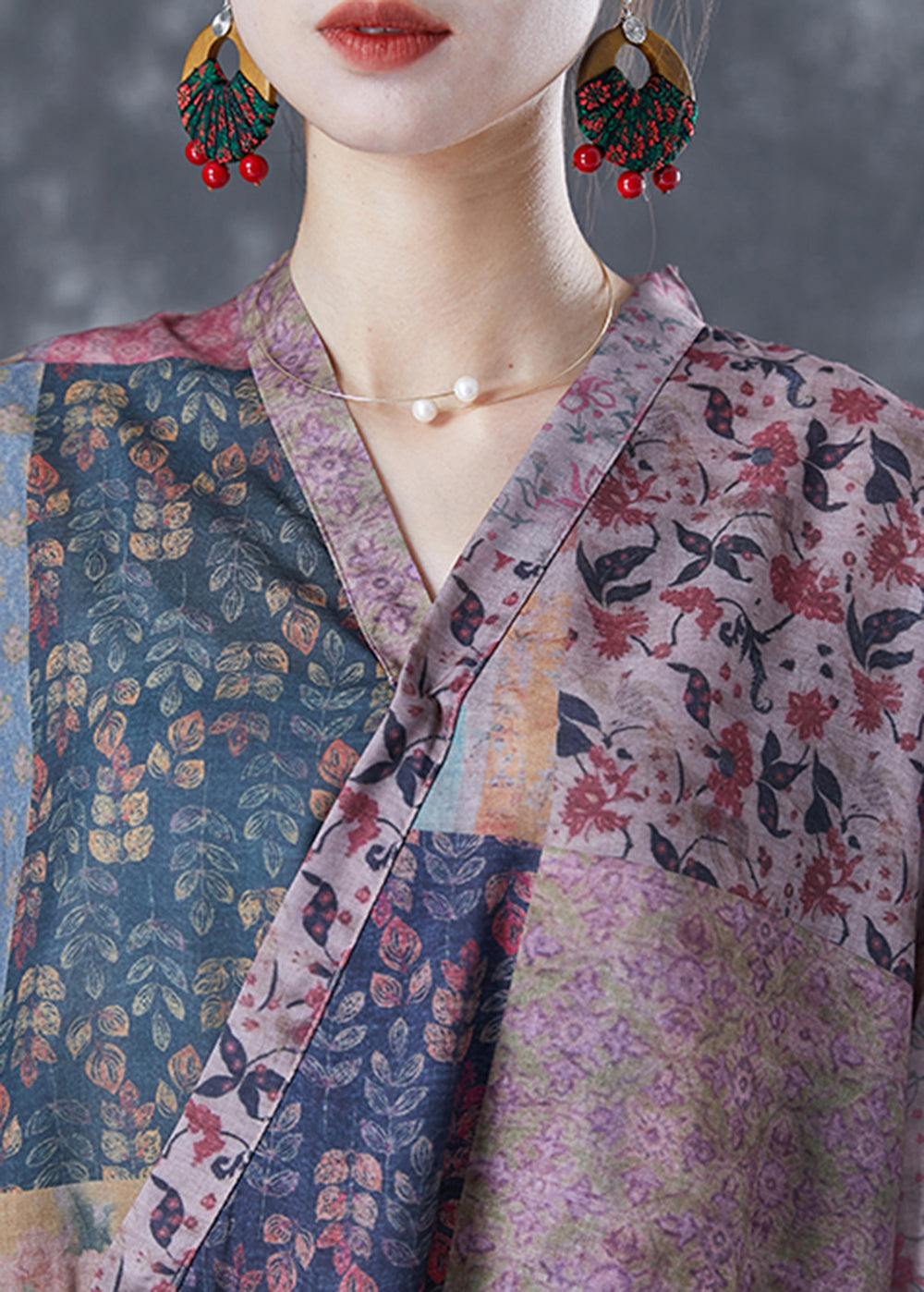 Retro Colorblock V Neck Patchwork Exra Large Hem Linen Dress Bracelet Sleeve