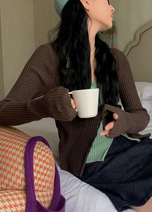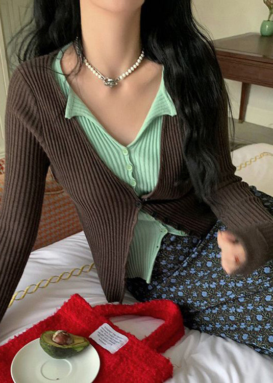 Slim Fit Coffee Button False Two Pieces Patchwork Knit Sweater Spring