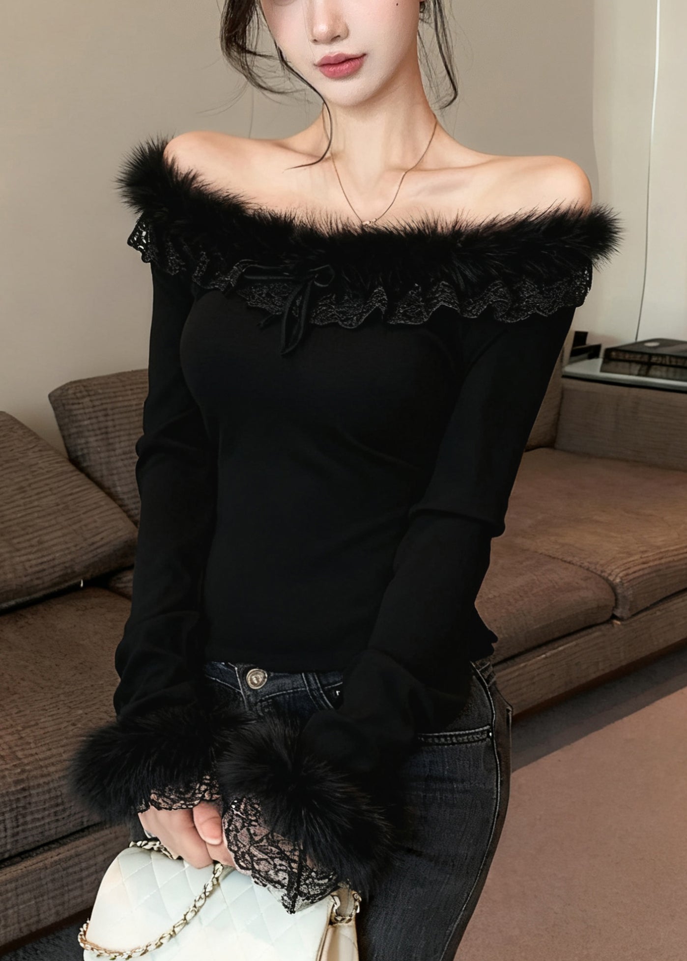 Slim Fit Grey Fur Collar Lace Patchwork Cotton T Shirt Winter