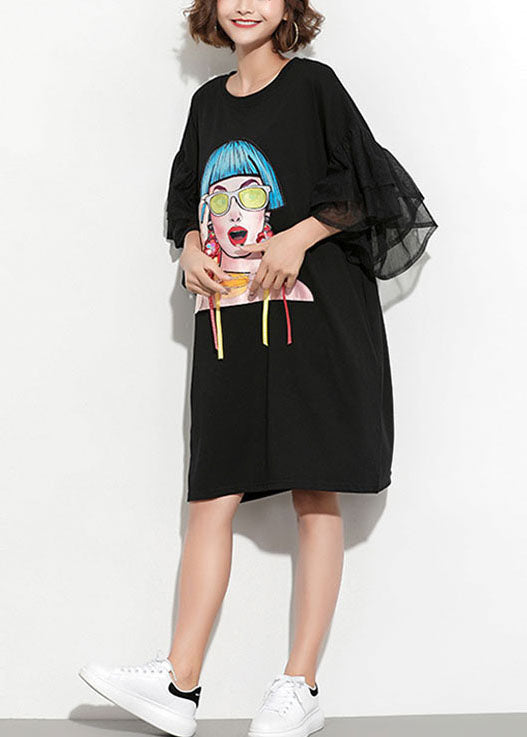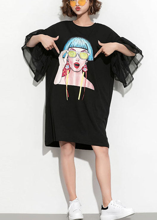 Streetwear Black O-Neck Tulle Patchwork Print Tassel Cotton Maxi Dresses Petal Sleeve