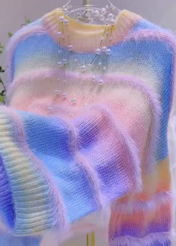Striped Green Gradient Color O Neck Cozy Knit Sweater Winter