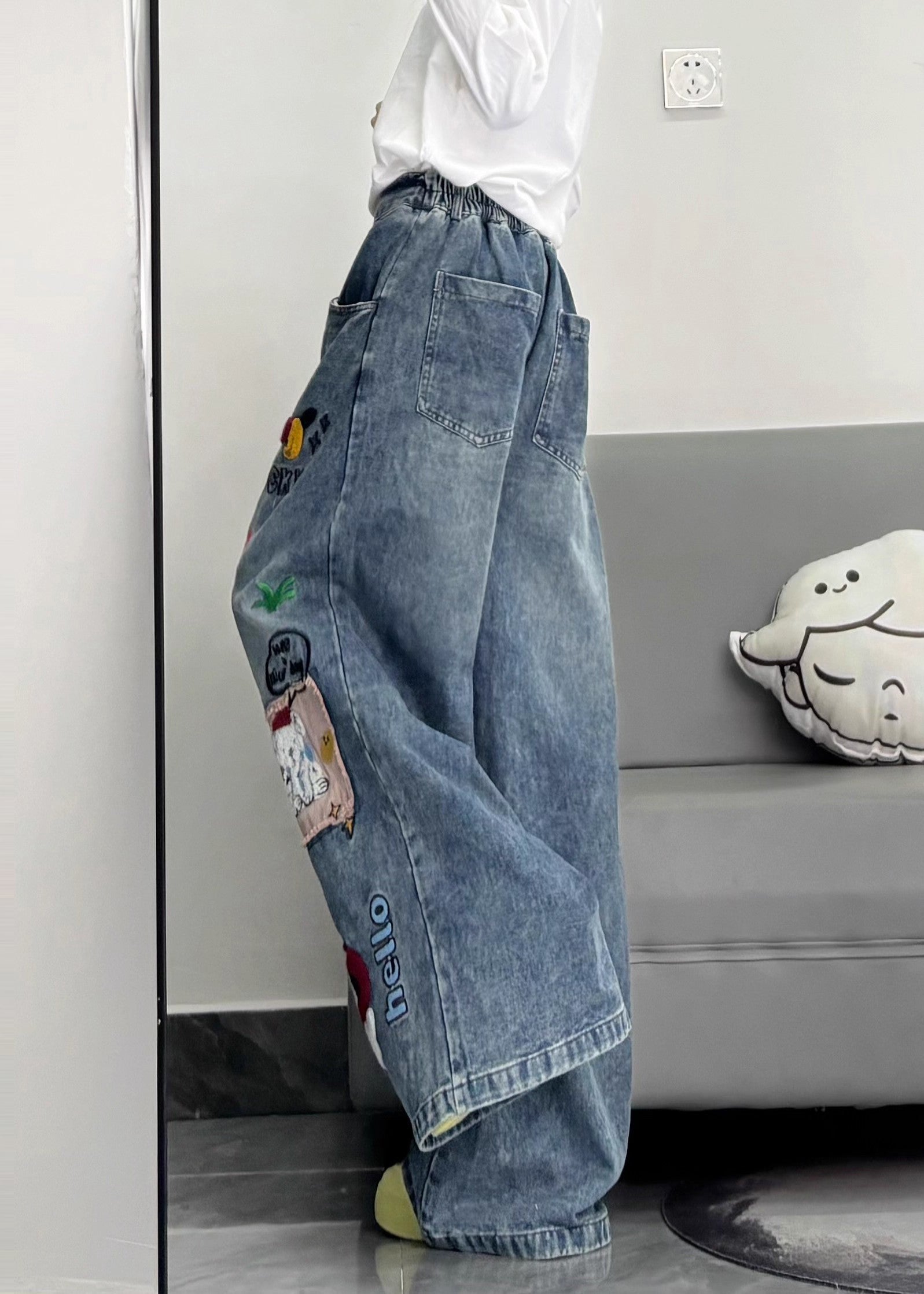 Style Blue Embroidered Patchwork Dog Applique Denim Straight Pants Spring