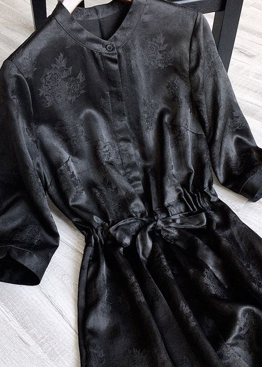 Stylish Black O Neck Jacquard Drawstring Silk Cinch Dresses Spring