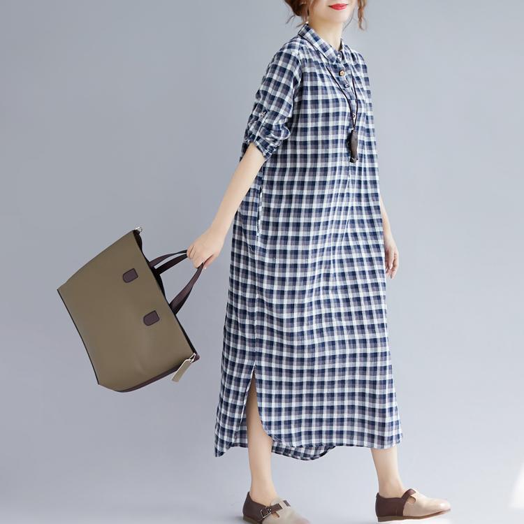 stylish blue Plaid cotton dresses plus size clothing Turn-down Collar traveling dress fine long sleeve side open maxi dresses