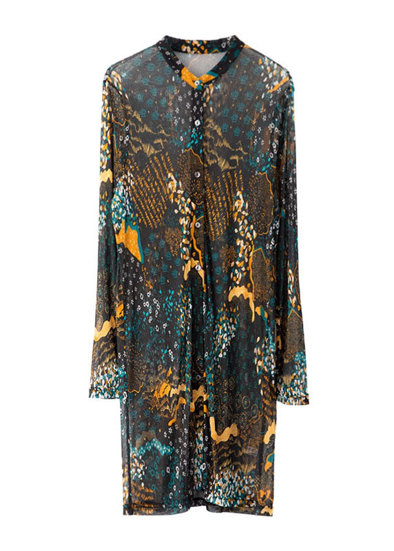 Stylish Blue Stand Collar Print Patchwork Tulle Cardigans Summer