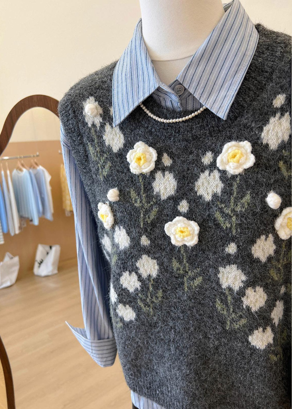 Unique Dark Grey O-Neck Embroideried Knit Vest Sleeveless