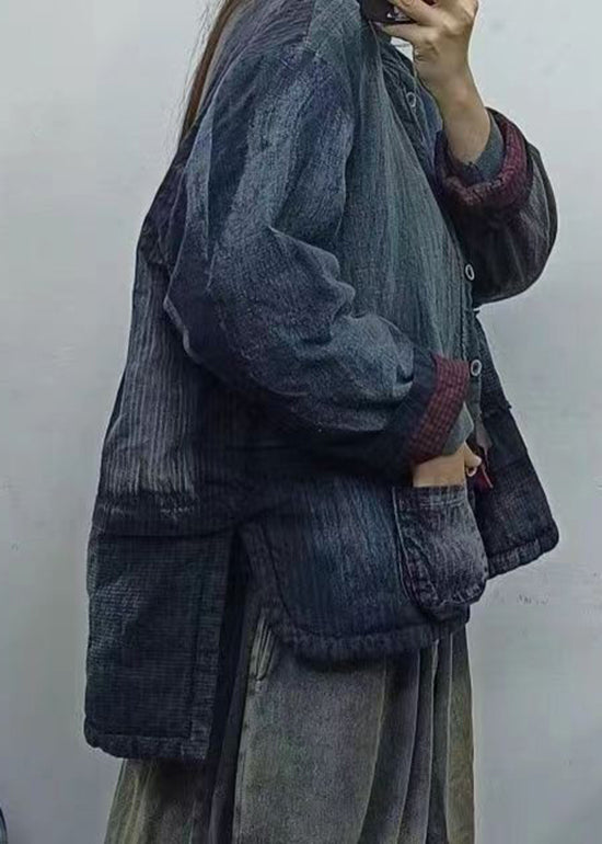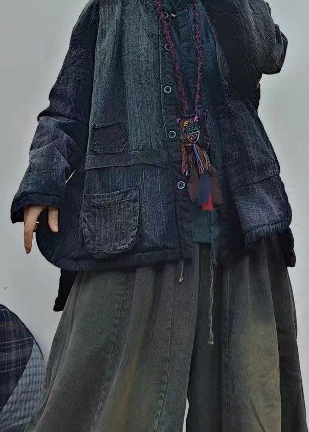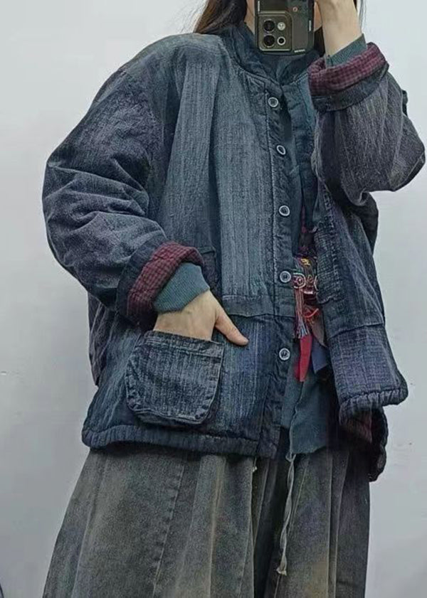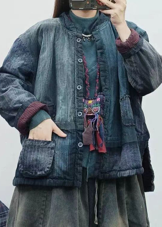 Vintage Blue Stand Collar Pockets Patchwork Fine Cotton Filled Jackets Winter
