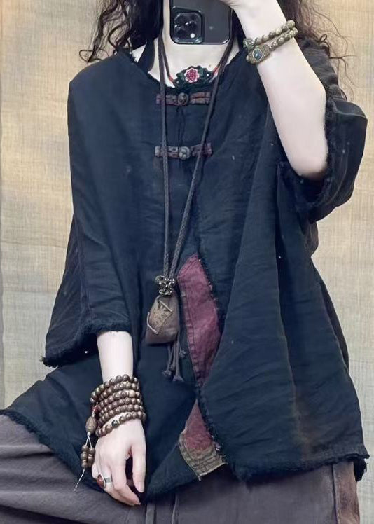 Vintage Coffee O Neck Solid Patchwork Linen Shirts Bracelet Sleeve